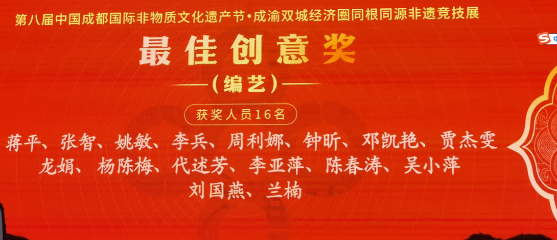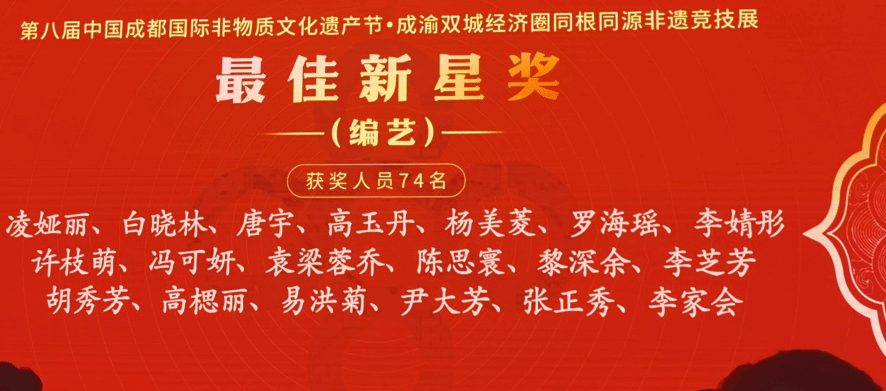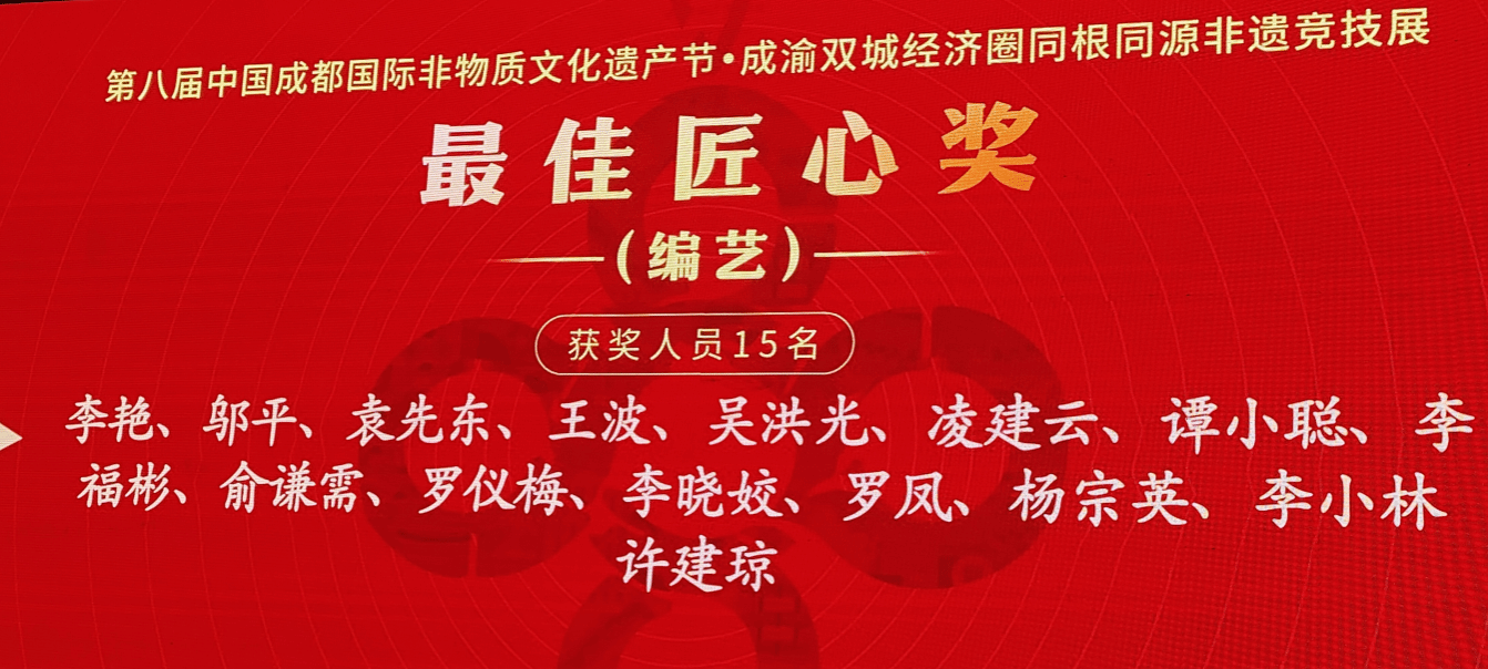10月12日至16日,第八届中国成都国际非物质文化遗产节“成渝双城经济圈同根同源非遗竞技展”在非遗国际博览园五洲情会展中心举行,在10月15日的“编艺”比赛中,来自成渝两地近200名选手参赛,我校外语与文化旅游学院教师杨宗英获得编艺组的“最佳匠心奖”;教师蒋平、张智、邓凯艳、贾杰雯获得编艺组的“最佳创意奖”;学生白晓林、唐宇、高玉丹、杨美菱获得编艺组的“最佳新星奖”。