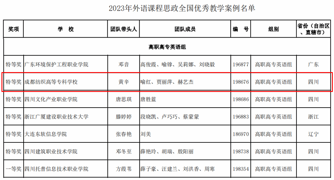 11月12日,由教育部高等学校大学外语教学指导委员会,高等教育出版社、全国高校教师网络培训中心、中国外语编辑部主办的“2023年外语课程思政优秀教学案例征集与交流活动”全国现场交流活动在湖南农业大学落下帷幕。我校外语与文化旅游学院教师黄辛、喻红、贾丽萍和赫艺杰团队与来自全国109支参赛队(高职28支)同台竞技,荣获高职组全国特等奖。