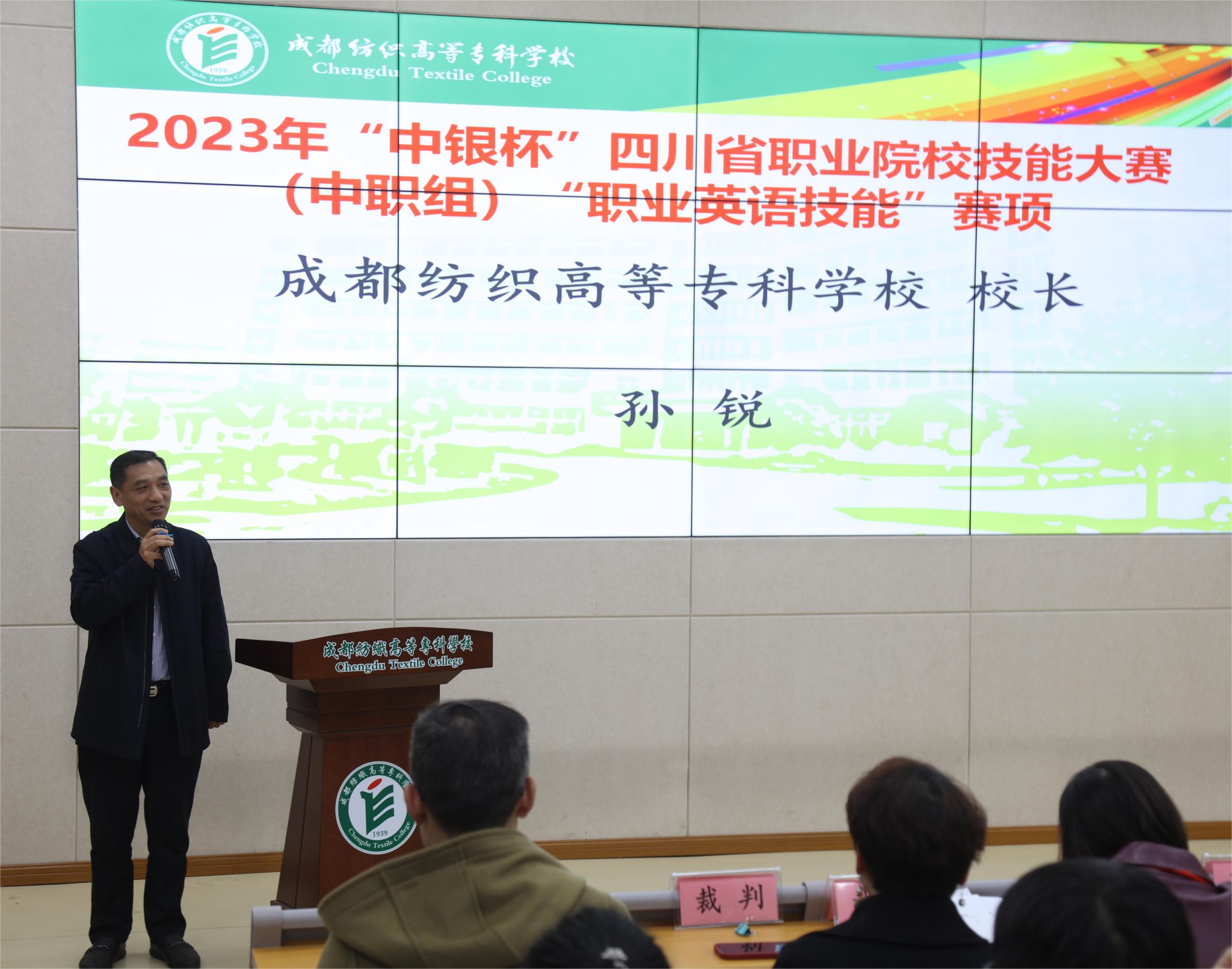 赛后,成都纺织高等专科学校校长孙锐为大赛致辞。孙校长对大赛的成功举行和各位选手取得的优异成绩表示了热烈祝贺,对全体裁判专家、工作人员和志愿者的辛勤付出表示由衷的感谢。孙校长指出我校承办赛项的初衷是为全省的中职英语教学参与者提供交流学习、拓展视野、展示才华、提升能力的平台。今年赛事第一次以现场直播的方式将比赛进程播出,全省师生都能看到选手的风采,这就给大家提供了更大的展示平台,也给全省中职的学生提供了一个很好的学习机会。孙校长指出,职业教育前景广阔,大有可为,我们要增强信心,培养更多高技能人才。希望师生们不断锤炼技艺,提升水平。