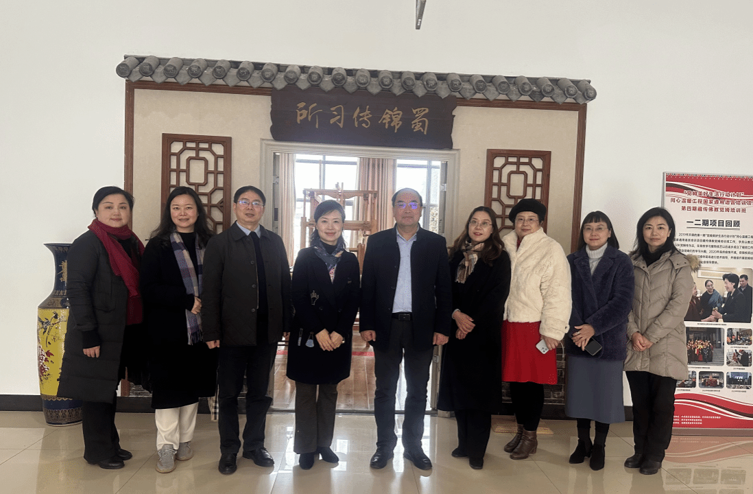 1月11月,重庆青年职业学院副校长、成渝地区双城经济圈文化和旅游产教联盟秘书长(重庆)、巴蜀非遗传承与创新专业教学资源库执行负责人周优文一行来校调研交流。文旅学院王敏副院长(主持工作)、课程团队成员陪同参观学校蜀锦传习所、蜀绣研究中心、绣艺苑学研馆、图书馆花楼织机和臻古堂家居馆,了解我校研学课程资源考察、课程开发和实施流程。就我校已加入的国家级巴蜀非遗传承与创新资源库的《研学旅行师指导实务》和《绳编技艺与文化》课程以及文旅专业群的中、英、日文为语言的多语种非遗特色课程等多个项目进行交流讨论。