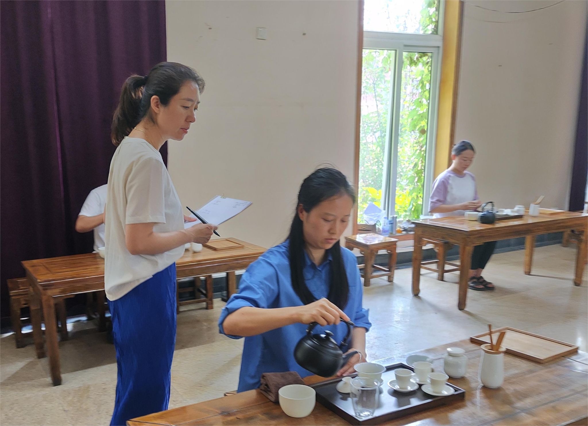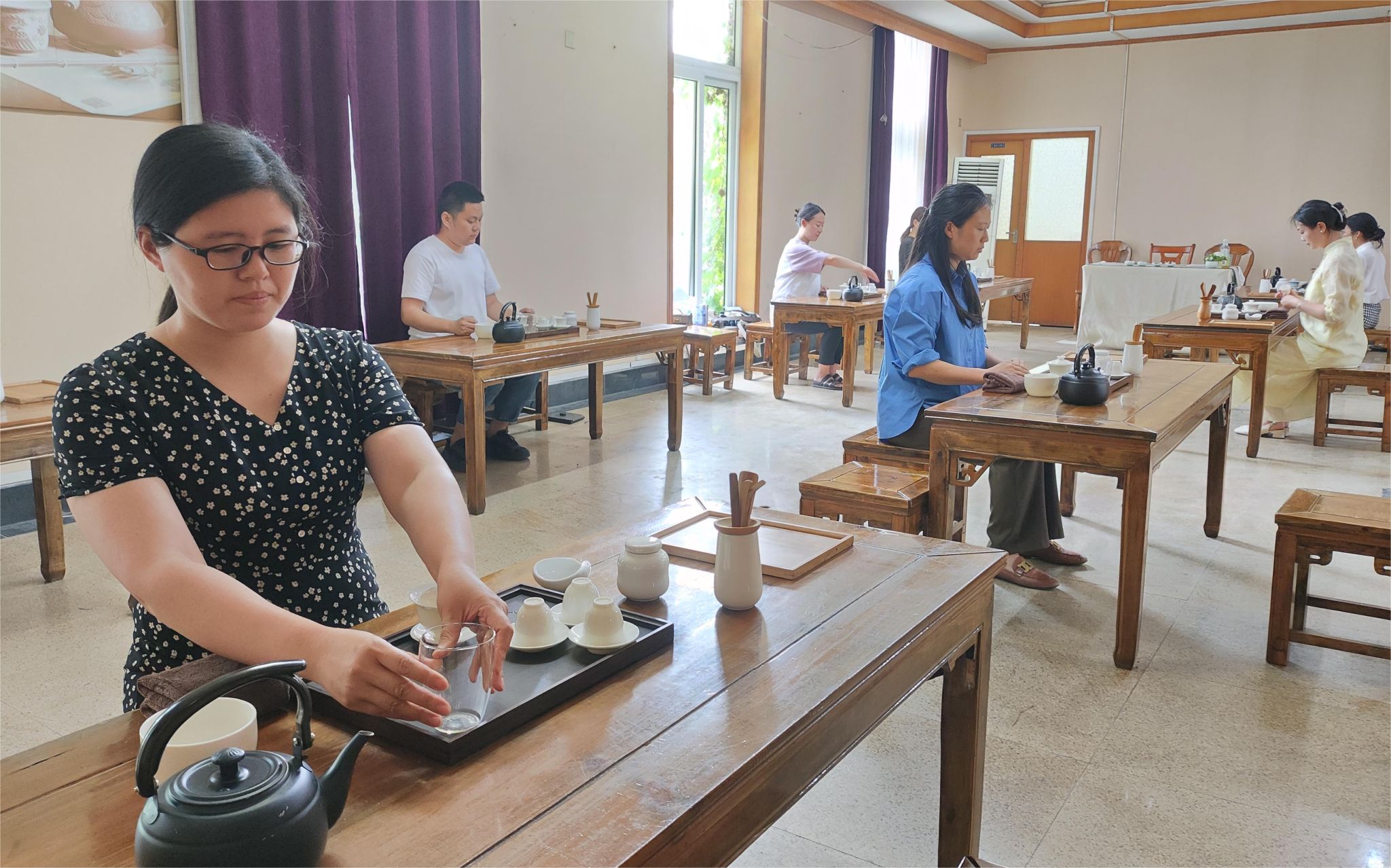 此次培训邀请一级评茶师、一级茶艺师杨婷婷、二级评茶师、高级茶艺师吕晞梅、高级茶艺师袁燕君和中级茶艺师梁洁等教师进行授课,采用“理论+实操”的方式进行茶艺知识讲授。学员们在老师的讲授和示范操作中,学习了茶艺的涵义、茶文化的基本知识和识茶认茶的方法,结合茶具和茶艺礼仪完成了泡茶的实操练习。