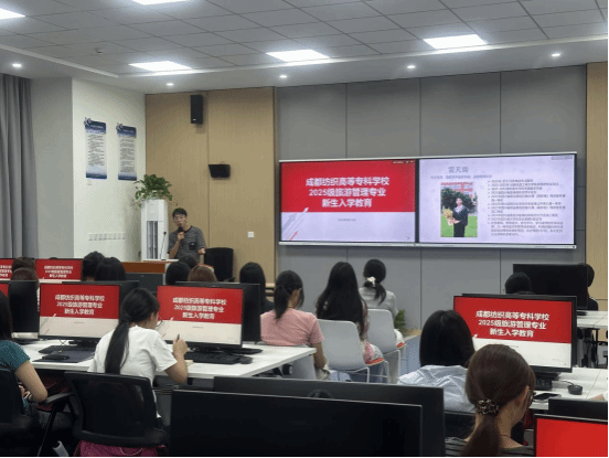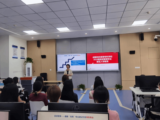 9月13日下午,外语与文化旅游学院旅游管理专业在邛崃校区知著楼 A402 召开 2025 级新生入学教育大会。四川省飞动文化旅游集团有限公司董事长张真波、成都旅游导游协会常务副会长贺亚萍、20 级优秀毕业生雷天雨受邀分享,专业全体师生参会,会议由专业负责人陈倩主持。