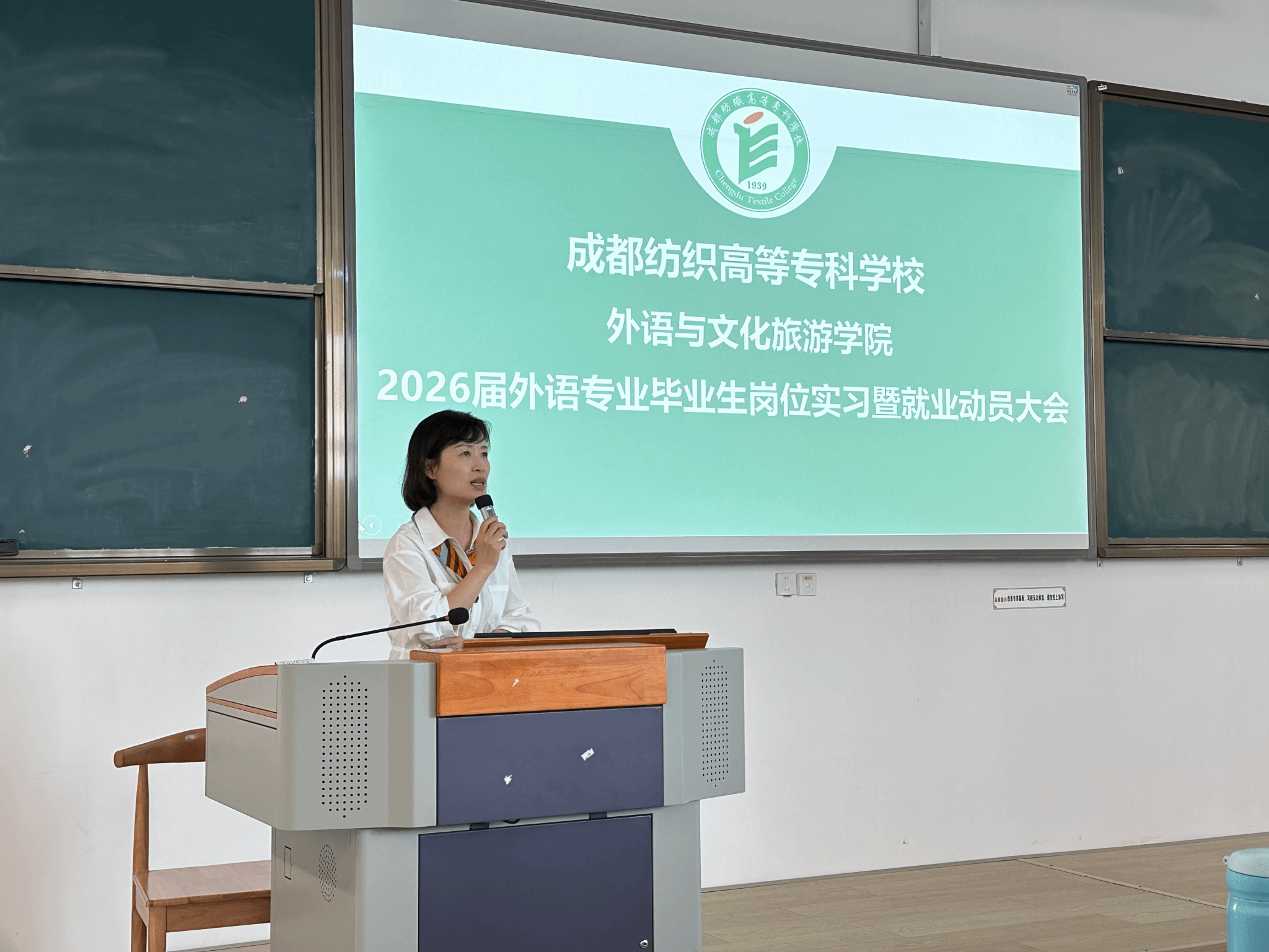 9月23日下午,外语与文化旅游学院在邛崃产教园区知著楼D101阶梯教室,召开2026届商务英语和旅游日语专业毕业生岗位实习暨就业动员大会。学院党总支书记王珍珍、副院长(主持工作)王敏、副院长梁金柱,及各专业负责人、指导教师、毕业班辅导员与全体毕业生参会,会议由外语教研室主任胡贞贞主持。