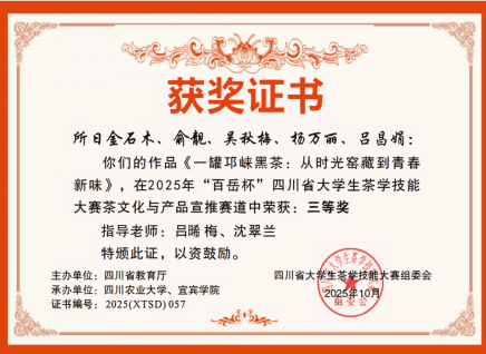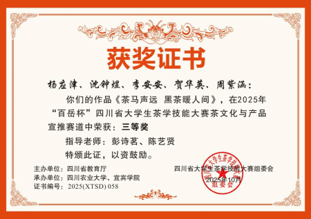 11月10日,由省教育厅主办、四川农业大学与宜宾学院联合承办的2025年“百岳杯”四川省大学生茶学技能大赛颁发获奖证书。我校4支跨学科团队在此次大赛中斩获4项三等奖。