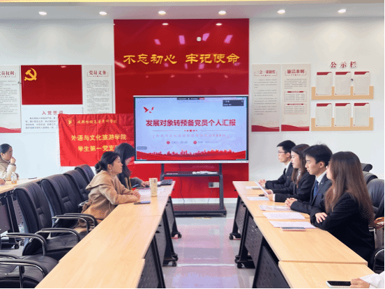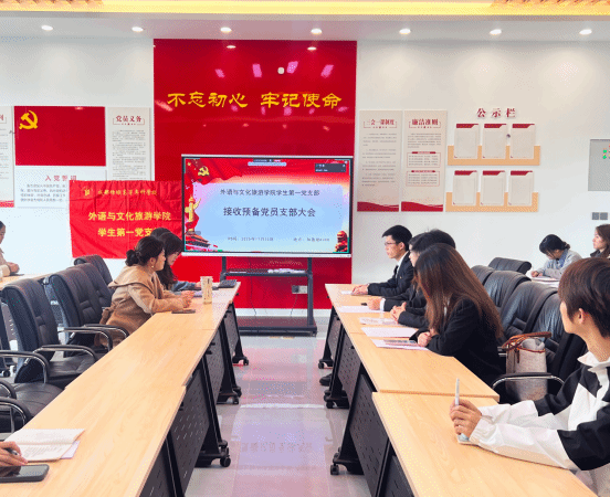 11月25日下午,文旅学院学生第一党支部在知著楼A405党员活动室召开支部大会,主要讨论杨沁颖等4名发展对象接收为中共预备党员相关事宜。文旅学院党总支书记王珍珍、宣传委员许梦雪以及学生第一党支部预备党员、发展对象、积极分子参加了本次会议,会议由许梦雪主持。