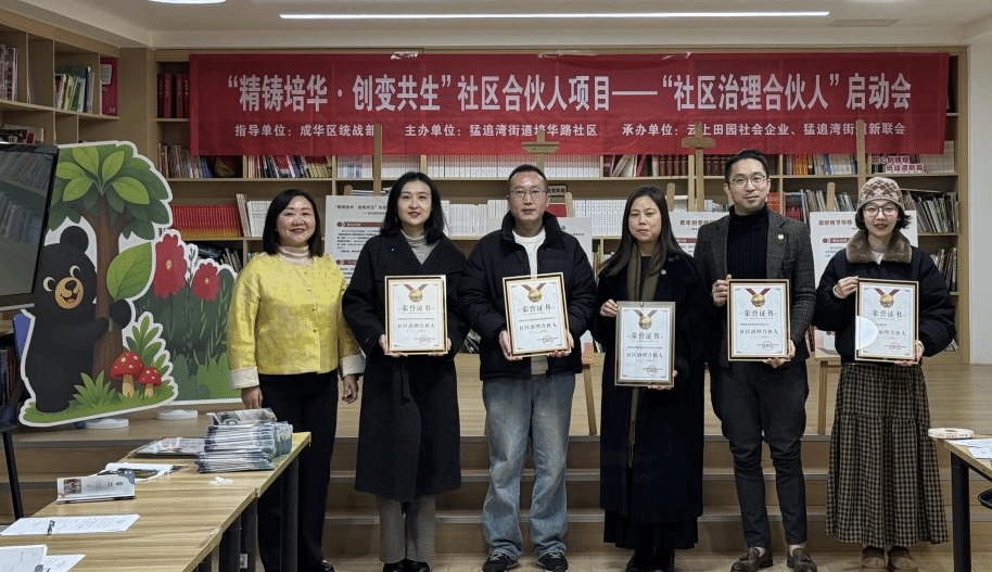 12月15日,成华区猛追湾街道培华路社区“社区治理合伙人”启动会暨授牌仪式举行,成都纺织高等专科学校外语与文化旅游学院获评社区首批“社区治理合伙人”,研学旅行管理与服务专业教师彭诗茗代表学院参会并接牌。学院与成都公交集团等10家企事业单位共同获此殊荣,校社共建合作正式开启。