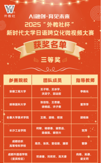 近日,以“AI 融创・育见未来”为主题的2025“外教社杯”新时代大学日语跨文化微视频大赛圆满收官。旅游日语专业周杰、曾佳靖、张凤、潘顺四位同学组成的参赛团队,在专业教师管静、李金芮、尹丽婷的悉心指导下,凭借融合专业特色与跨文化视角的微视频作品,成功荣获本次大赛三等奖。