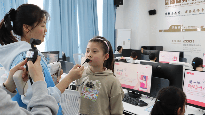 本次活动紧扣“研学+产教融合”理念,依托学校优质实训资源,设计了大学探秘、趣味英语课堂、非遗绳编技艺、童星主播四大板块。上午,孩子们在大学生志愿者带领下,走进产教融合实训楼、运动场、图书馆等场所,近距离观察高校真实的教学与实训场景,了解职业教育与产业发展的紧密联系,激发对未来的职业想象。