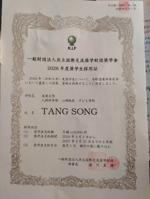 4月9日,从日本东亚大学传来喜讯:我院通过校际合作项目赴日参加专升本学习的23级旅游日语专业唐菘,凭借优异的综合表现,成功获得“共立国际交流财团奖学金”。该生从众多申请者中脱颖而出,成为本年度日本全国仅有的8名本科生获奖者之一。