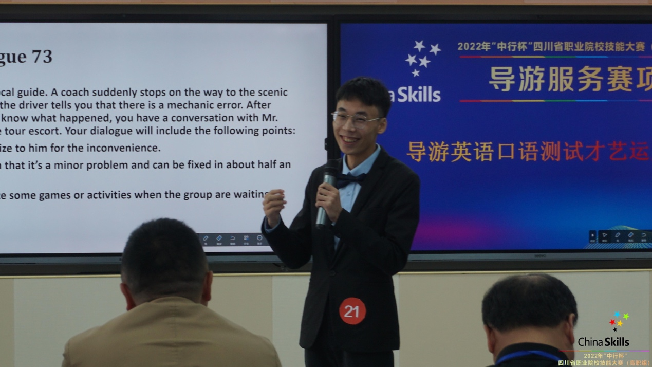 本次大赛为个人赛,共有来自全省36所高职院校的68名在校大学生参加比赛,旨在以旅游服务技能核心环节—导游服务技能为载体,通过竞赛“以赛促学、以赛促教”,展示四川参赛选手的职业素养与能力。比赛按照国赛赛制进行,不分组别,要求选手同时具备普通话和英语讲解能力,赛项包括导游知识测试、现场导游词创作及讲解、自选景点导游讲解、导游英语口语测试和才艺运用等五部分内容,分别考察参赛选手的导游基础知识掌握、导游词创作与讲解、英语口语及才艺展示能力,同时也对参赛选手的现场应变能力、心理素质等多方面进行了全面检验。雷天雨同学在比赛过程中沉着冷静、发挥出色,凭借丰富的文化素养、极强的创作能力、扎实的讲解功底、流利的英语、精湛的才艺获得裁判组的高度认可。