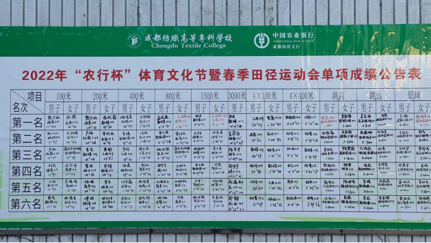 4月18日至20日,成都纺织高等专科学校2022年“农行杯”体育文化节暨春季田径运动会在南苑足球场上顺利举行。