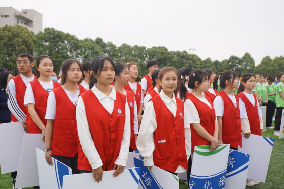 4月18日的开幕式,文旅学院方阵特色十足,老师们身穿蓝色西装,手持向日葵花束,同学们高喊学院口号,彰显了文旅学院师生昂扬向上的青春风采。