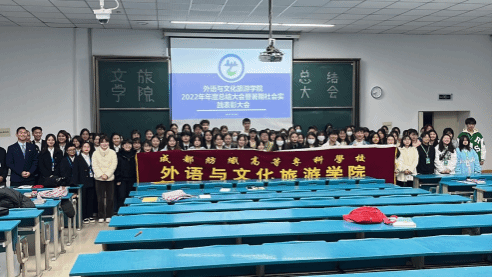 大会对2022年文旅学院暑期社会实践获得先进个人的同学进行了表彰。2022年暑假,文旅学院共有129名同学参加社会实践,其中有61位同学获得院级先进个人称号,学院推选13名同学获得校级先进个人称号。此外,学院组织的“旅传文情”暑期社会实践团队获得了成都纺织高等专科学校2022年暑期“三下乡”社会实践优秀团队;同时,文旅学院是我校唯一一个获得了2022年成都市大中专学生暑期社会实践优秀组织单位的学院。