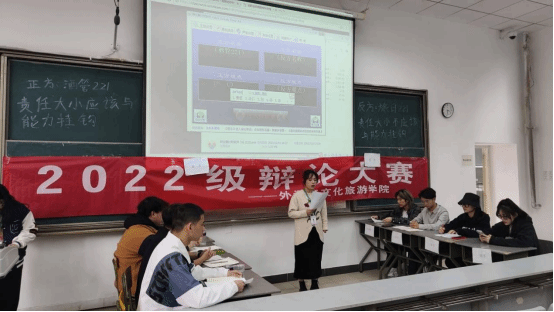 3月14日下午,文旅学院2022级学生辩论赛半决赛在C103成功举行。正方酒店管理221班,反方旅游日语221班,辩题为“责任是否与能力有关”。本次比赛邀请文旅学院专职辅导员贾杰雯、许梦雪老师,主席团成员高玉丹、陈鑫容,学生会组织部部长张红月担任评委。