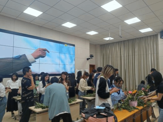 最后展示的是“陌上蒹葭”花艺社,他们为同学们讲解了花艺相关知识,并带领各个协会的同学和老师们进行了现场插花活动。经过老师们激烈的讨论,最后绘梦刀画协会的插花作品获得了第一名。